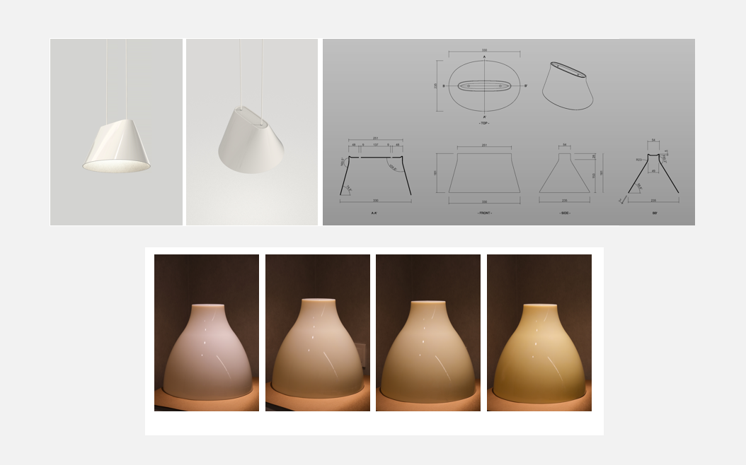 최근 스마트폰을 이용한 Home Iot 시장이 급격하게 증가했고, 이러한 트렌드는 조명으로도 확산되었다. 하지만 대부분 기존 디자인에 스마트 램프를 적용하는 방식이었고, 스마트 램프의 다양한 색, 밝기 변환 기능을 중점적으로 고려해 디자인한 조명은 없다. 우리는 변화의 흐름에 맞춰 스마트 전구를 가장 잘 활용할 수 있는 디자인을 개발하고자 하였다. 마릴린 팬던트 조명은 스마트램프 특성을 고려한 디자인이다. 미니스커트를 연상시키는 우아한 형태의 갓이 다양한 빛을 아름답게 담아낸다. 반투명 PC소재로 제작해 빛을 고르게 확산시켜 눈부심을 줄이고, 가벼우면서도 내구성이 뛰어나 실용성까지 갖춘 조명이다.